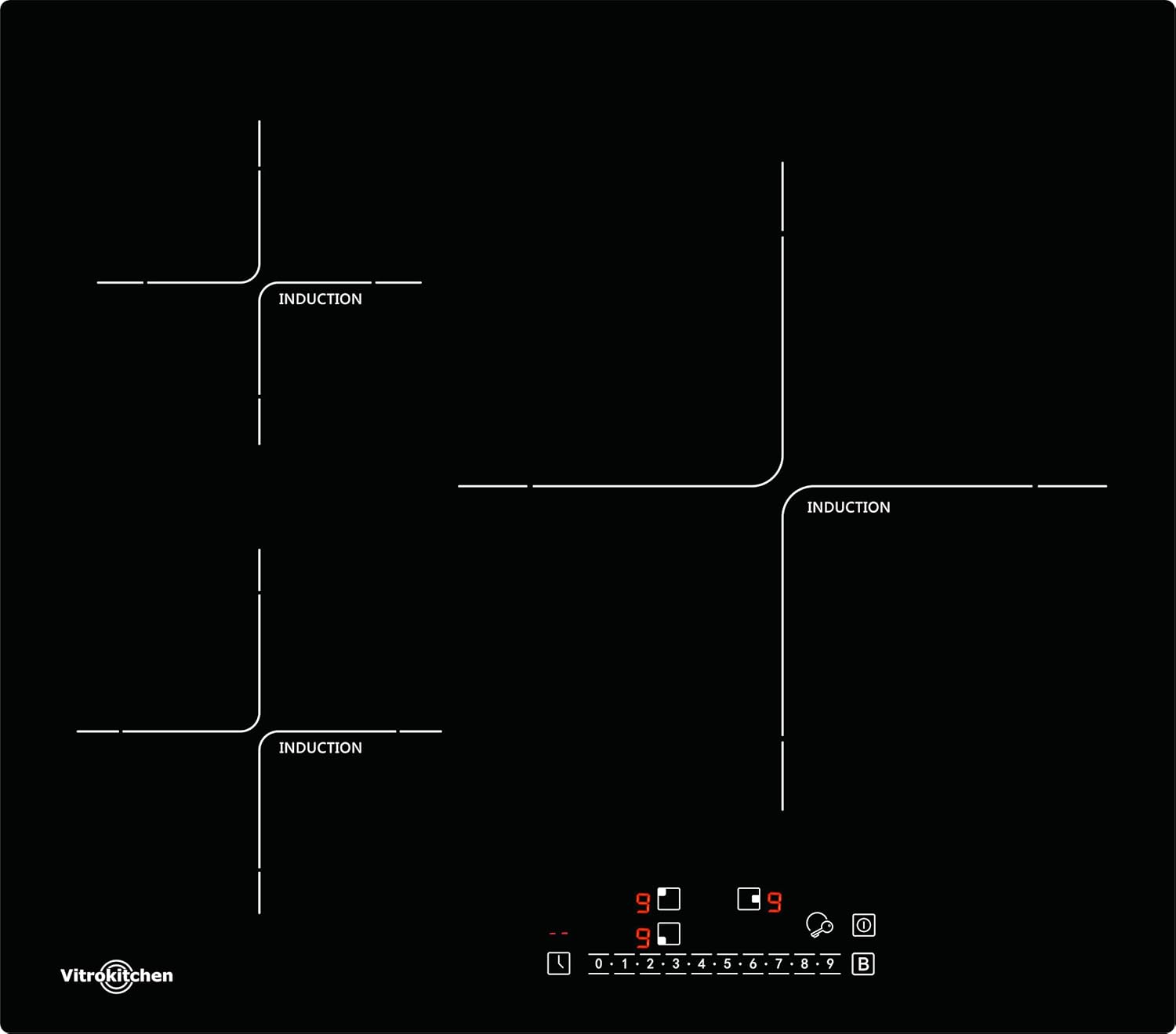 Vitrokitchen IND630N - Placa de Inducción, Zona EXTRA GRANDE 32cm, 3 zonas, 9 Niveles de Potencia, Indicador Calor Residual, Bloqueo de Seguridad Niños.
